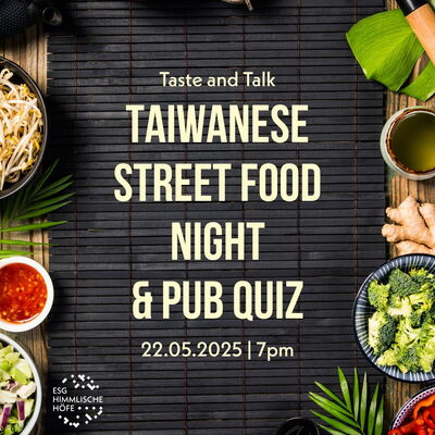 Looking for some original taste? We are curious about Ming's Magic in our ESG Kitchen this thursday offering specialities from Taiwan. Besides some of us will have an eye on the trditional Pub Quiz, competeting with 40 other ESGs and KSGs. Come along and please be in time!